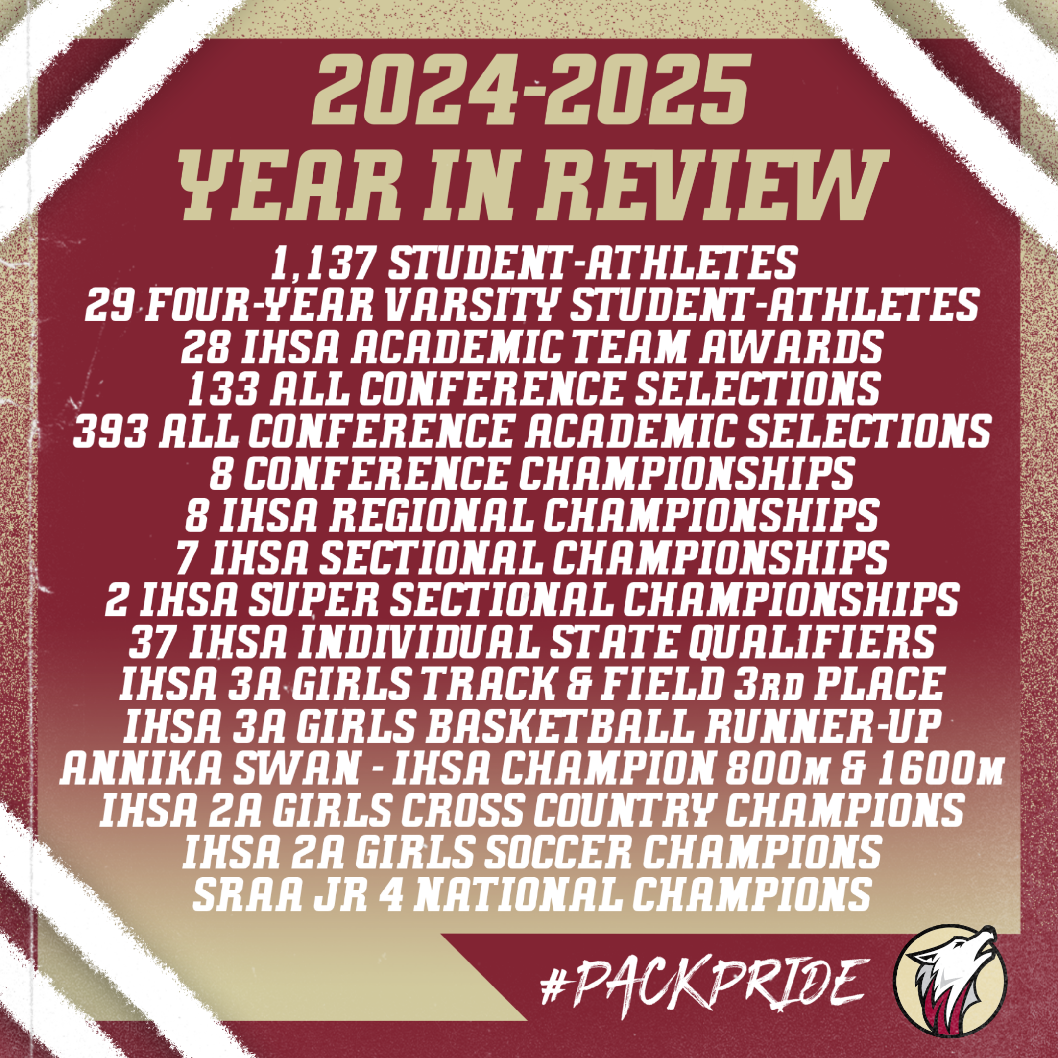 As a member of the Chicago Catholic League (CCL), the Girls Catholic Athletic Conference (GCAC), Chicago Catholic Hockey League (CCHL), Interscholastic Sailing Association (ISSA), Illinois State Field Hockey Association (ISFHA), Midwest Rowing Scholastic Association (MRSA) and the Metro Catholic Aquatics Conference (MCAC), the Wolfpack prides itself in competing with top-flight competition on the freshman, sophomore, junior varsity and varsity levels.